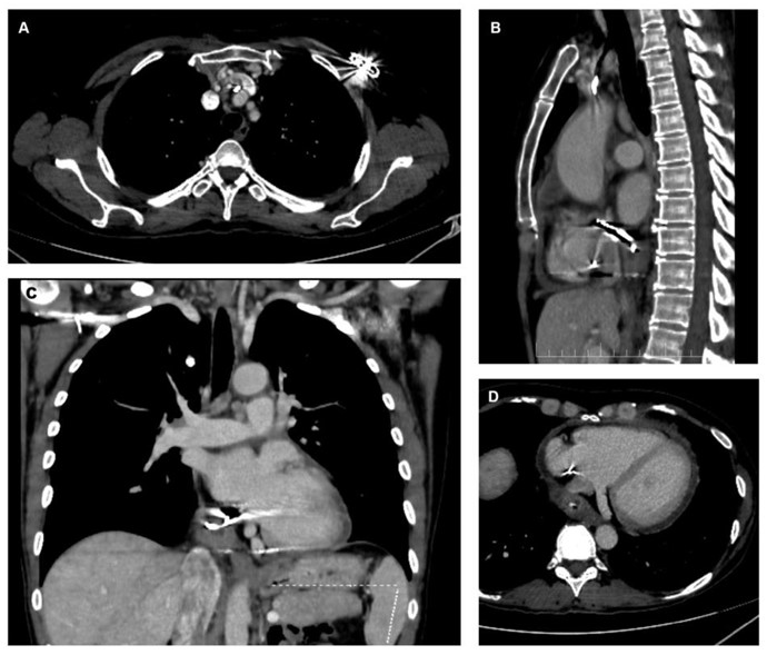 The patient was subsequently admitted to the Internal Medicine Department, and a contrast-enhanced computed tomography (CT) of the body was performed. The scan revealed that the atrial lead of the pacemaker traversed the inferoposterior wall of the RA. The lead tip appeared to be located within the pericardial sac, surrounded by a centimeter-sized fluid collection suggestive of abscess formation (Fig. 2A-D). The vena cavae were dilated, and the pericardium demonstrated mild enhancement and effusion suggestive of probable pericarditis.