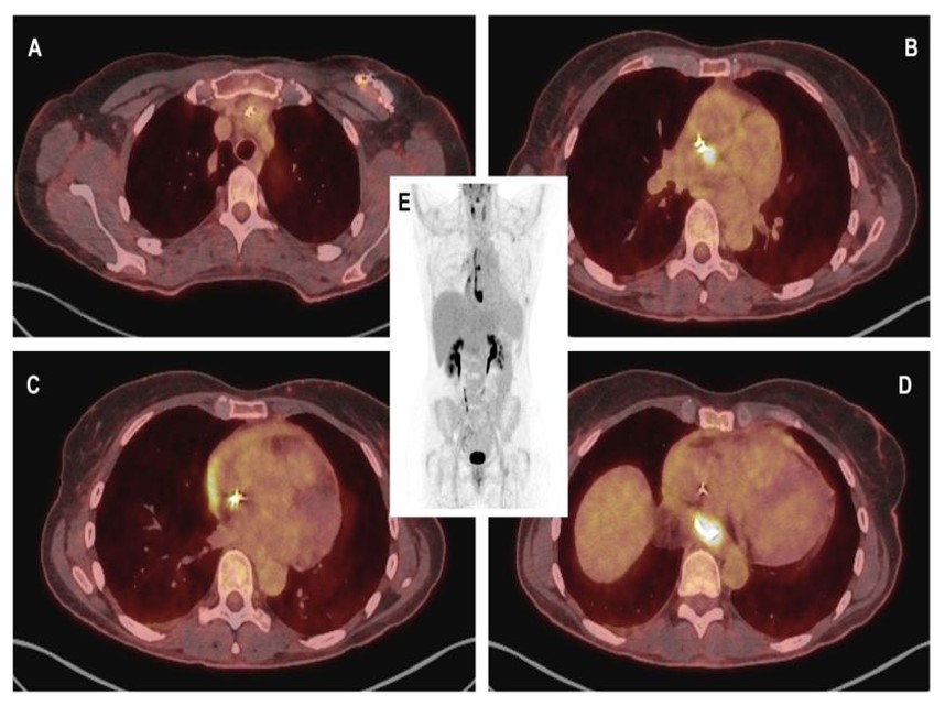 Fused CT-PET with 18F-FDG images (A) showing slight metabolic activity at the lead exit point, with more intense uptake from the entrance into the innominate vein extending to its distal end; (B) exhibiting greater focality in the middle third; and (D) demonstrating the region of the paraesophageal pericardial abscess, with a maximum standardized uptake value (SUVmax) of 16. (C) A thin line of activity was observed in the pericardial effusion, more intense in the region adjacent to the right atrium. (E) Volumetric PET reconstruction demonstrates the previously described findings.